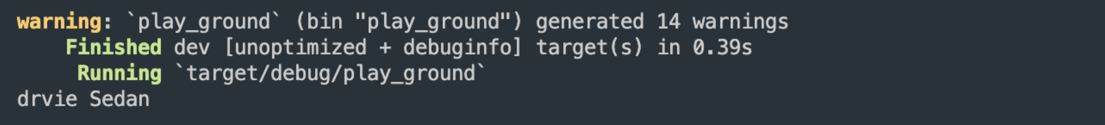Car Trait은 drive 메소드를 갖고 있고, Sedan과 Suv Struct는 Car Trait을 구현하고 있습니다.