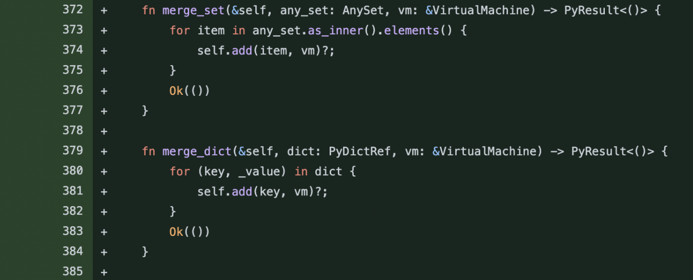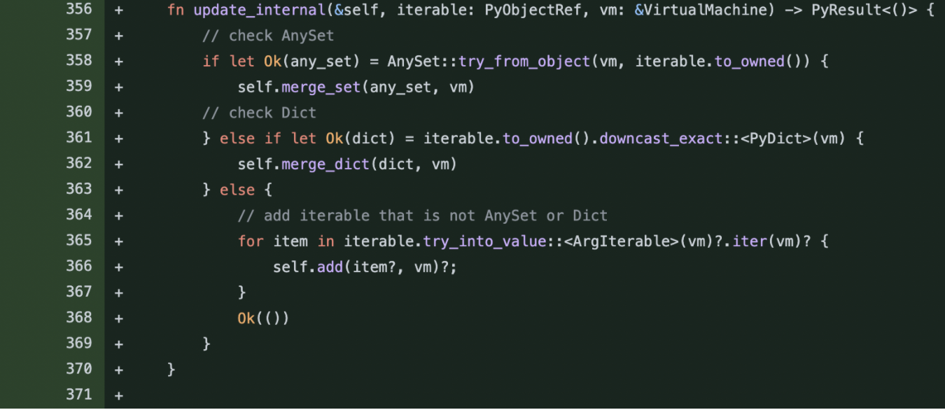 RustPython set.update() 함수는 인자로 들어온 iterable 객체가 set 타입인지 dict 타입인지 검사하는 로직이 아직 구현되어있지 않았습니다.